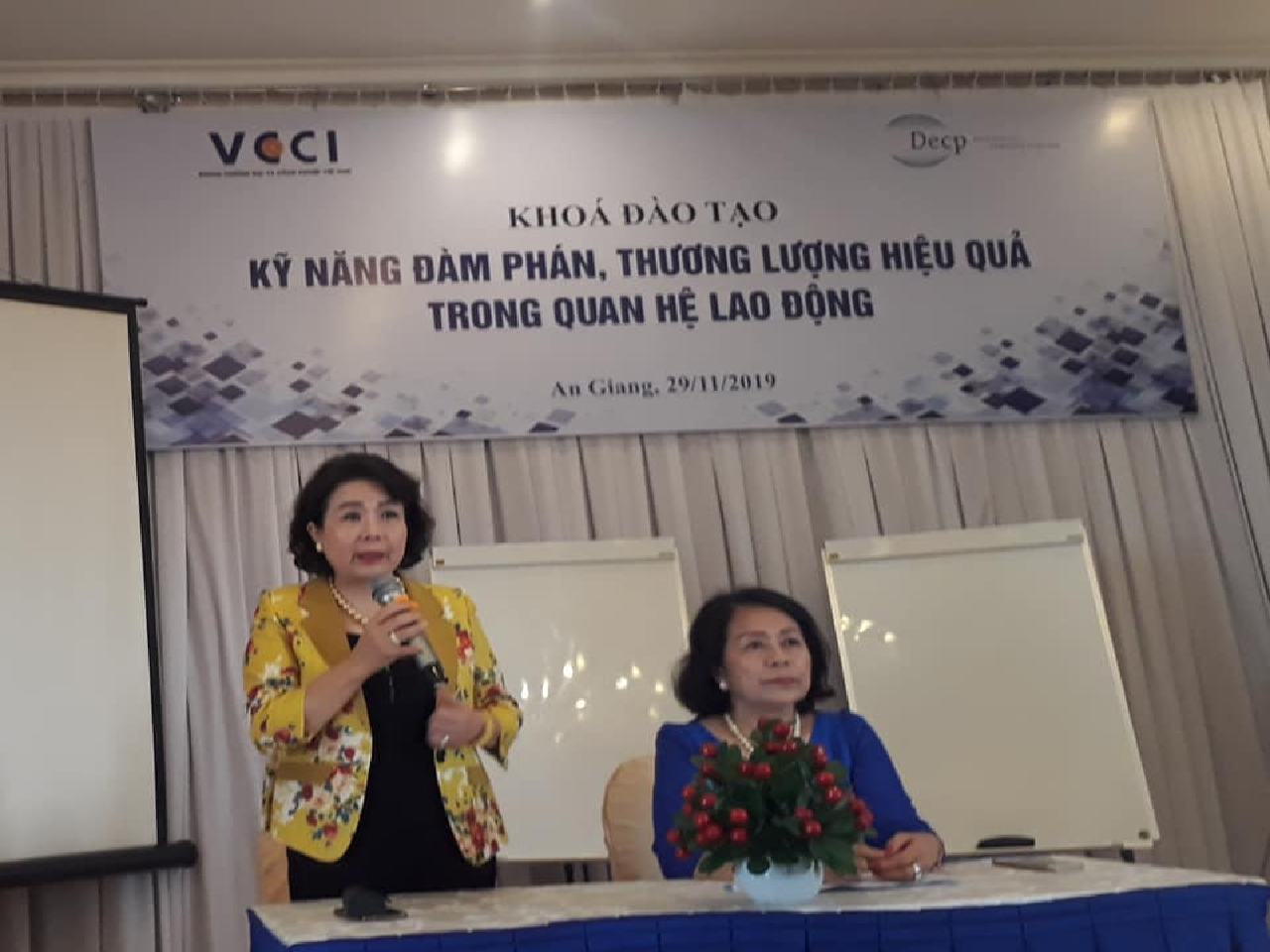 Ngày 29/11 tại Khách sạn Đông Xuyên Hội đồng Nữ Doanh nhân Việt Nam - VCCI Việt Nam phối hợp với Hội Nữ Doanh nhân tỉnh An Giang tổ chức khóa đào tạo "Kỹ năng đàm phán, thương lượng hiệu quả trong quan hệ lao động" . Có 30 doanh nghiệp tham dự khóa đào tạo này.
